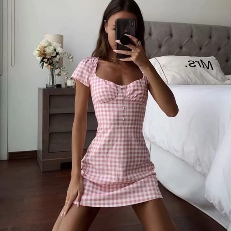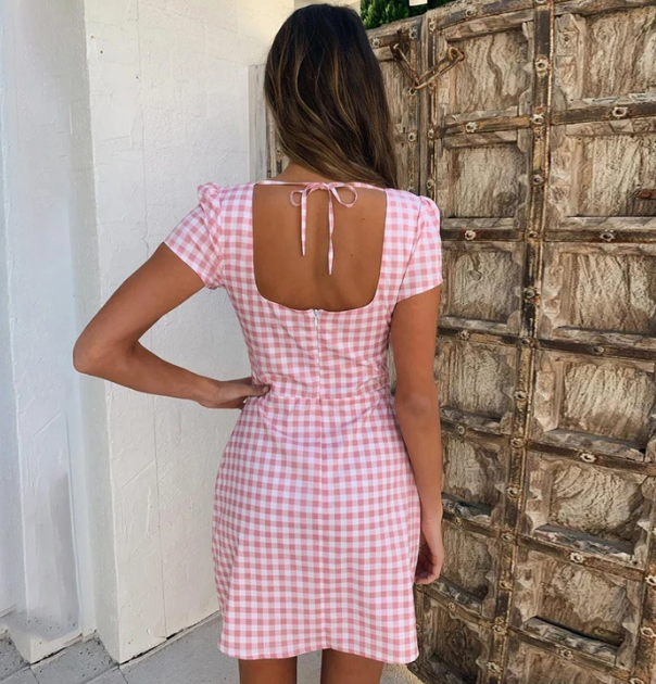 Women's Short Sleeve Buttoned Slim Plaid Dress