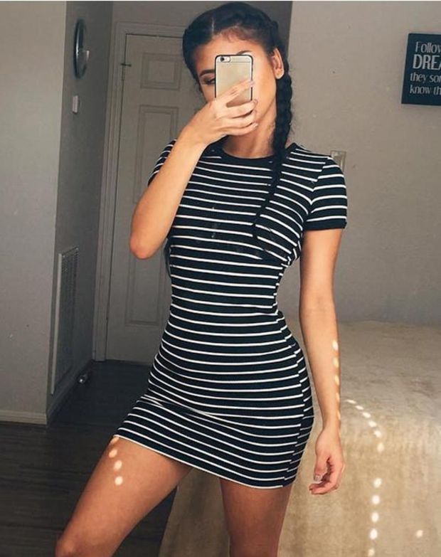Short Sleeve Black And White Striped Dresses Casual Elegant Sheath Slim Dress