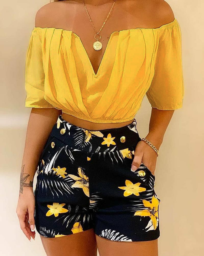 Off Shoulder Ruched Top & Tropical Print Shorts Set