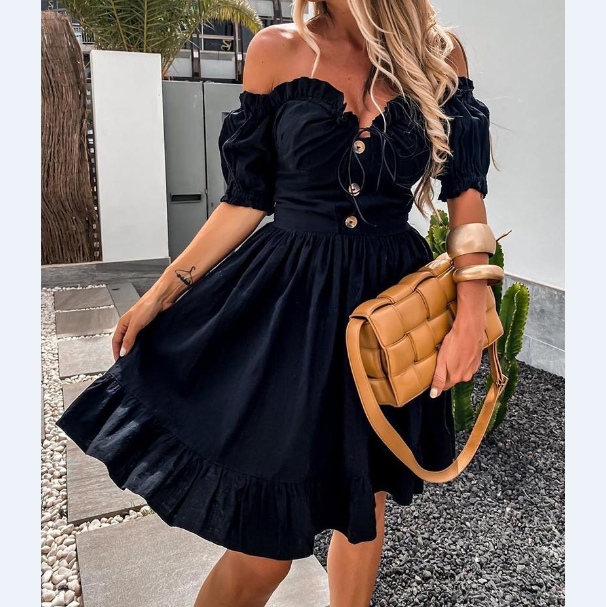 Off Shoulder Sweetheart Neck Button Design Frill Hem Dress