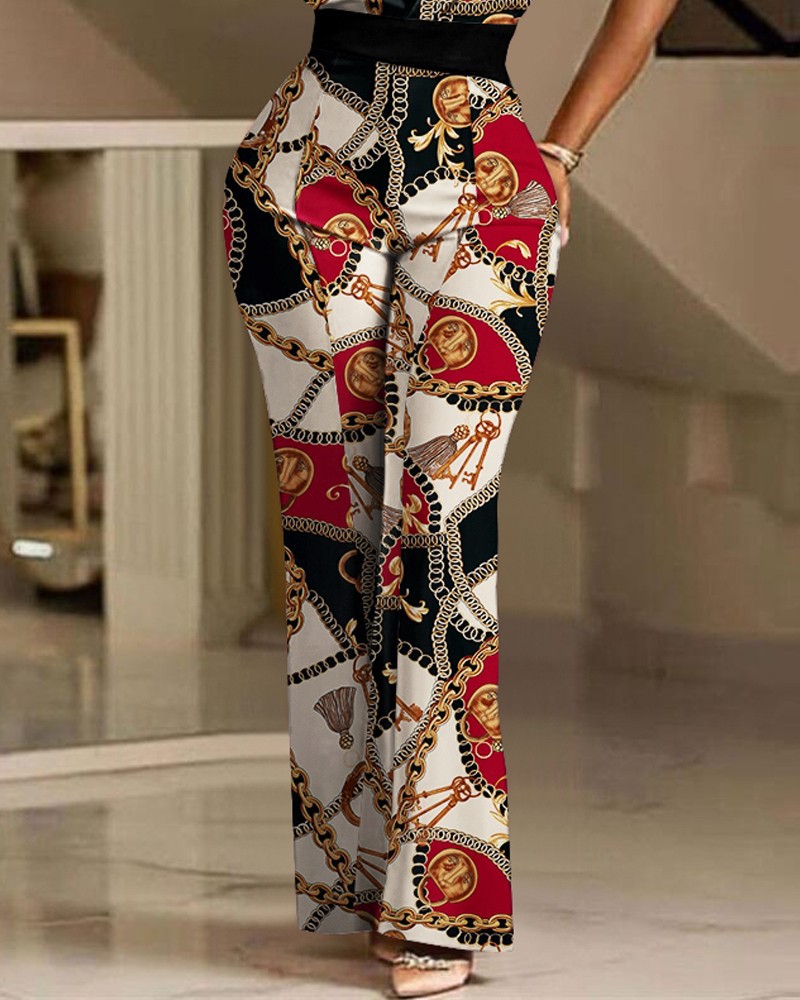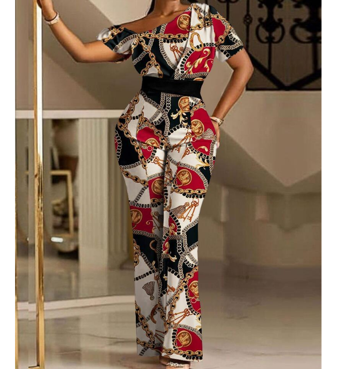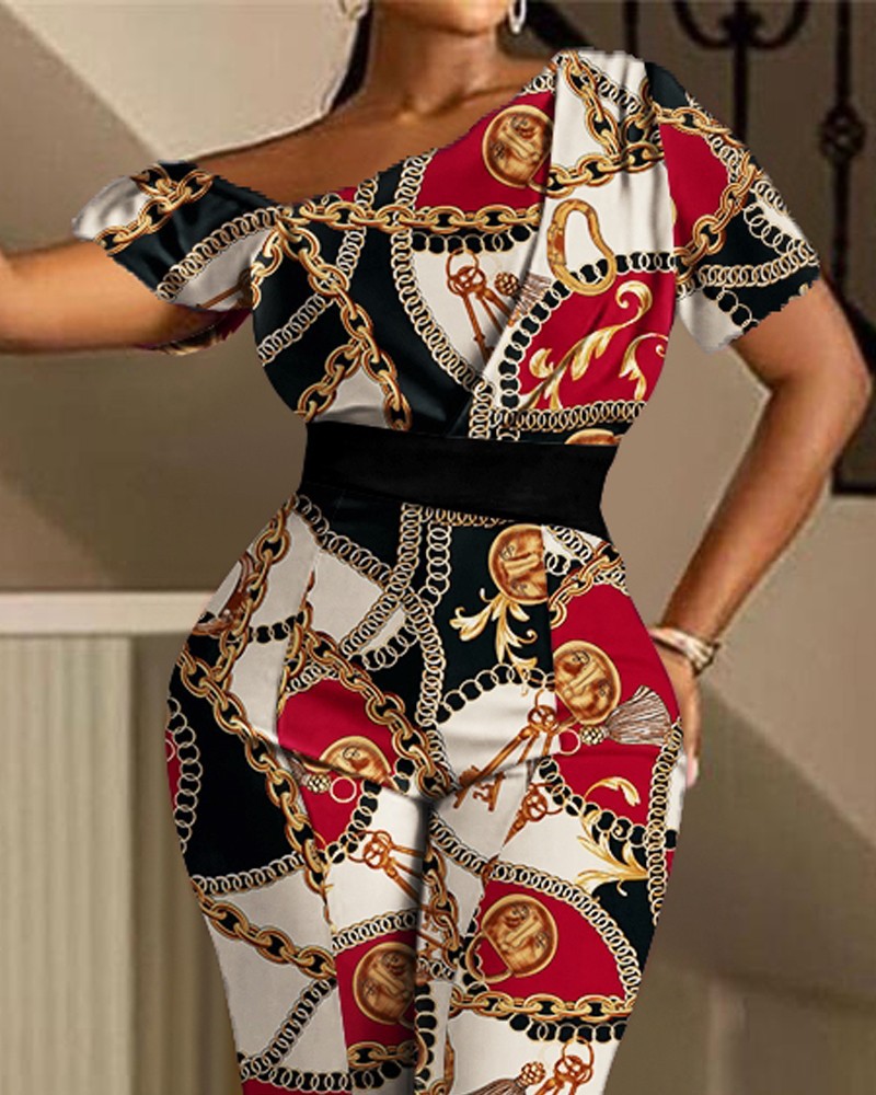 Women'S Fashion Chain Printed High Waisted Short Sleeved Jumpsuit