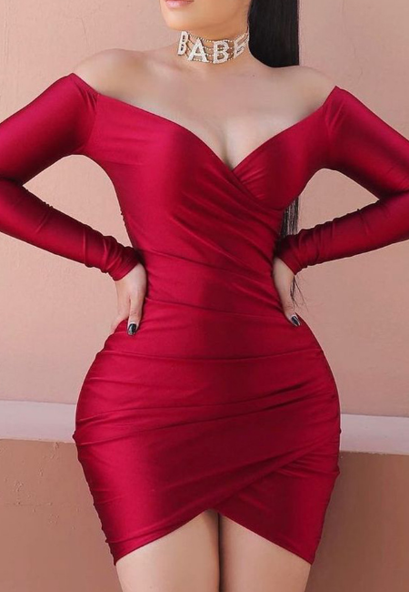 V-Neck Red Solid Color Long Sleeve Wrap Up Dress