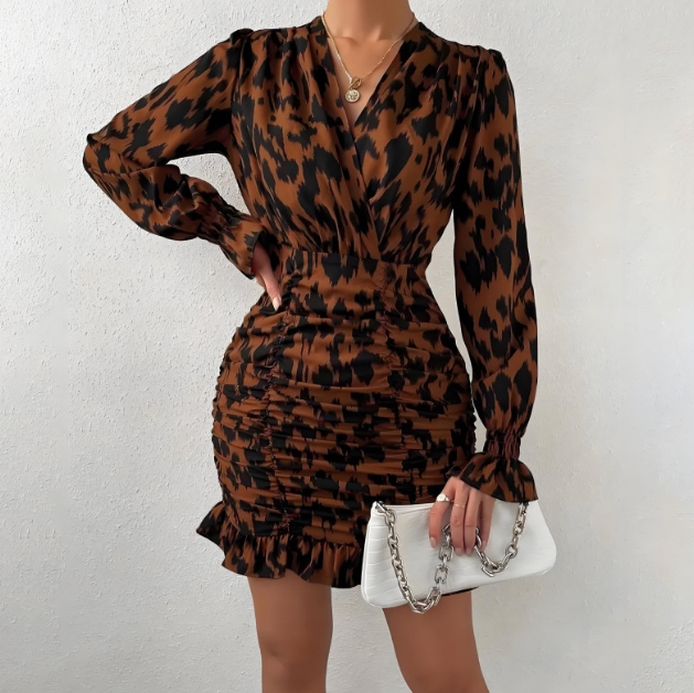 Long Sleeves Women'S Slim V-Neck Leopard Print Dress
