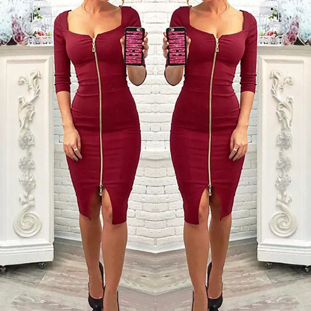 Fashion Solid Color Zipper Slim Sexy Package Hip Dress