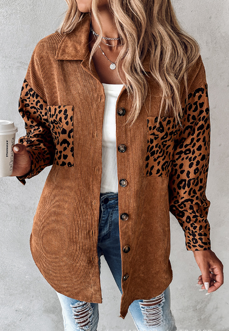 Solid Color Temperament Leopard Print Contrasting Long Sleeved Jacket