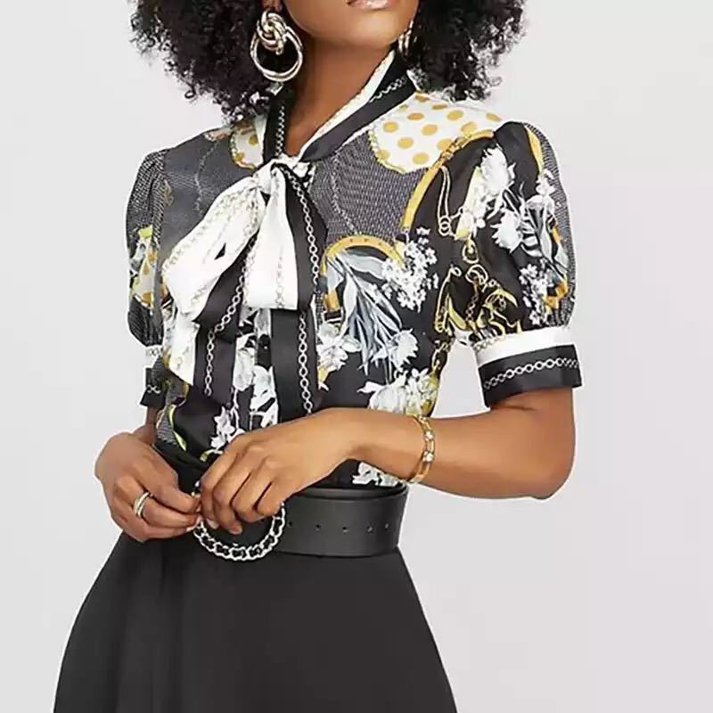Printed Short Sleeve Bow Puff Sleeve Shirt