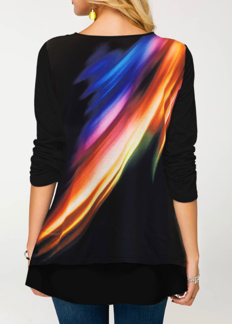 Printed Long Sleeve Round Neck Rainbow Color T Shirt