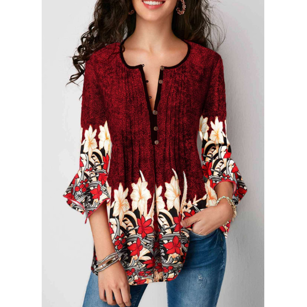 Printed Button Up Pleated Three Quarter Sleeve Blouse
