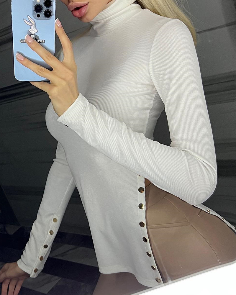 Elegant White High Neck Split Long Sleeve Tight Top
