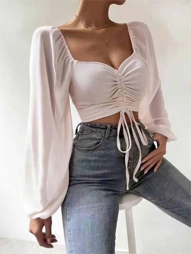 Long Sleeved Pit Stripe Patchwork Chiffon Tight Top