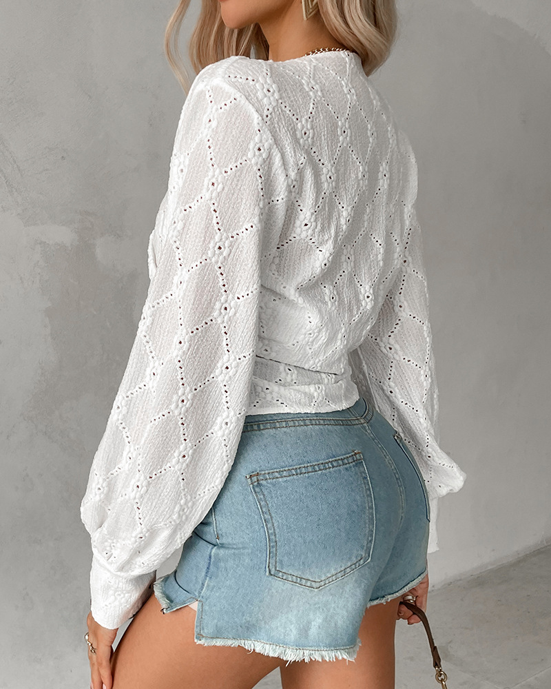 Embroidered Solid Color V-Neck Long Sleeved Shirt