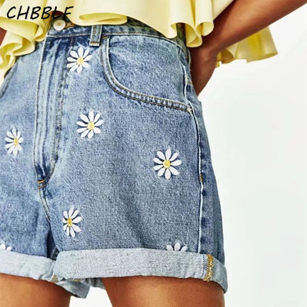 Spring Summer New Daisy Embroidery Bermuda Shorts Women Fashion High Waist Shorts Denim Short Jeans