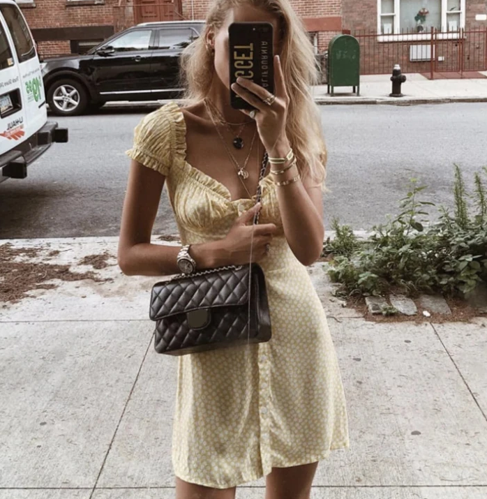 Material: Chiffon Gender: Women Item Type:Dress Color: Yellow Size: S, M, L