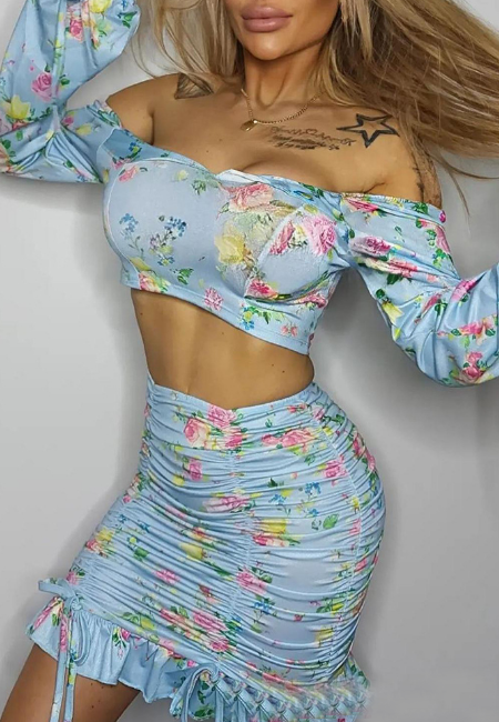 Temperament Off Shoulder Long Sleeve Printed Two Piece Set