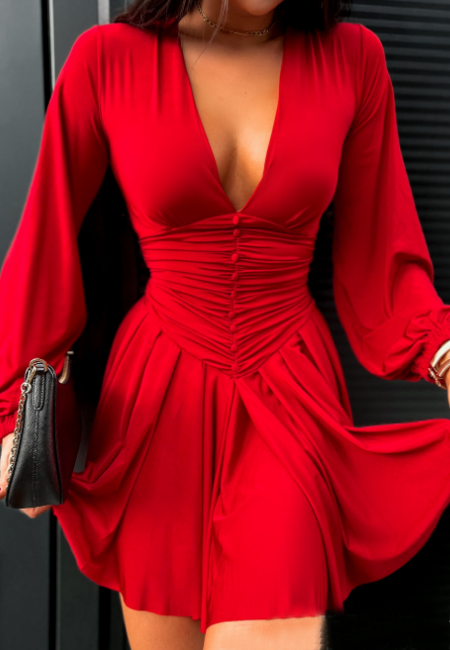 Red Solid Color Deep V-Neck Long Sleeved Dress